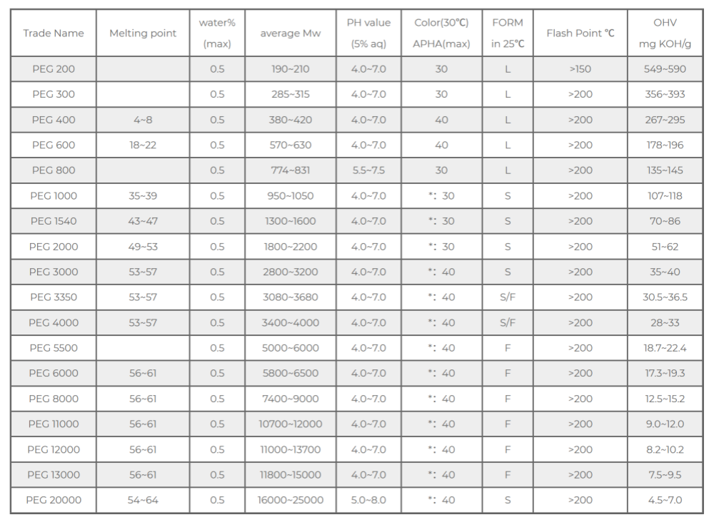 PEG-1000 nganti PEG-4000: Bobot molekul medium, padatan lilin. Nalika bobot molekul mundhak, viskositas lan titik leleh uga mundhak. Contone, PEG-3350 minangka basis supositoria lan ointment sing umum digunakake ing obat-obatan, nyedhiyakake kemampuan kanggo mbentuk lan kinerja pelepasan obat sing apik.